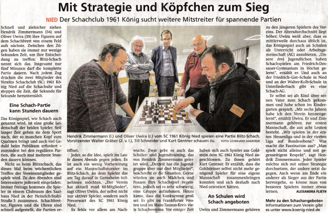 On March 6th, press attendant Oliver Uwira welcomed a journalist of Frankfurter Neue Presse for an interview about the topic "chess for everybody". The result was an interesting report about the essence of a chess club, in which, beside Oliver, youth attendant Hendrik Zimmermann and Kurt Gentner also had a voice. The article was published on March 9th by the Frankfurter Neue Presse, but unfortunately is not available online. We have digitalized the printed version, of course.